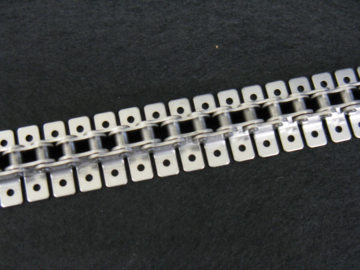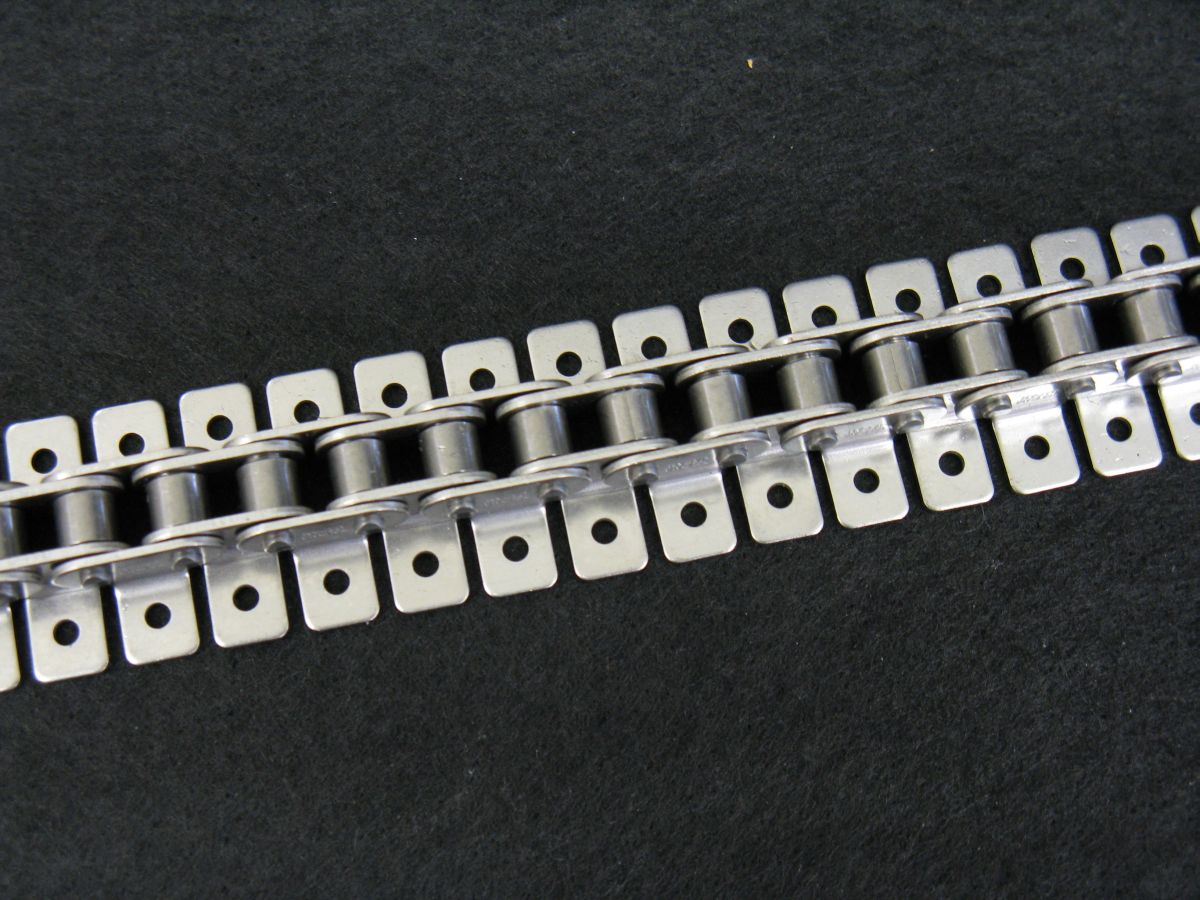 RF06B roller chain with K1 attachments both sides every link, all stainless steel. Sold in lengths up to 100 ft. with a minimum of 10 ft.